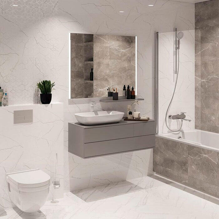 Коллекция Siluet беларусского производителя BeryozaCeramica представляет собой современную интерпретацию классики. Основная плитка для стен представлена в двух цветах: белом и серо-коричневом оттенке “мокко”. В качестве дополнения к коллекции идут два вида декорации: геометрический декор в виде орнамента и мелкозернистая мозаика со светлым фоном и темными вкраплениями.Характеристики