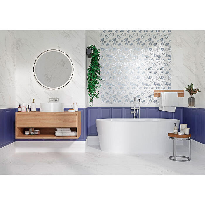 Коллекция Gracia Ceramica Scarlett - больше синего! Именно этот цвет стал визитной карточкой коллекции Scarlett. Матовая поверхность, сочетание кобальта с благородным белым мрамором – вот что делает классическую коллекцию такой трендовой. Изюминка Scarlett – декоративная вставка с рельефными цветами, лепестки и листья которых, благодаря обработке "шайн ", приобрели благородный перламутровый блеск. Дополнительные элементы – матовый плинтус и бордюр – дают возможность выкладывать плиты вертикально и без подрезки, упрощая монтаж сантехники на привычном уровне.Характеристики