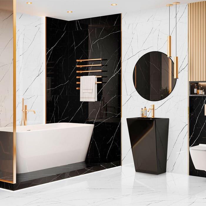 Коллекция керамогранита Twinstone представлена двумя камнями-«близнецами» — первый имеет чёрный мраморный фон с белыми характерными контрастными прожилками, а второй является его инверсией. Эти два артикула могут быть готовым решением для интерьера. Такой дизайн подойдет не только для классических интерьеров или стиля арт-деко, но и для современного пространства, особенно при дополнении благородной текстурой дерева или аксессуарами из металла.Характеристики