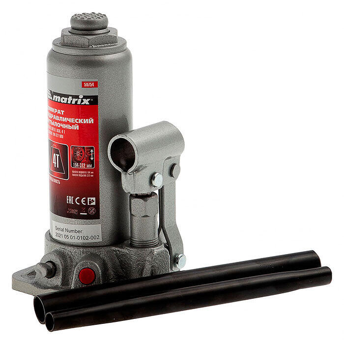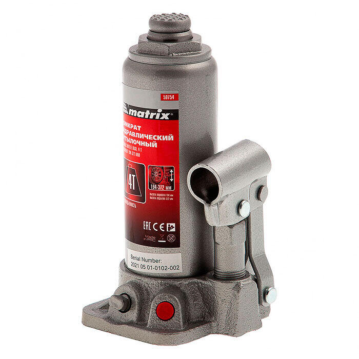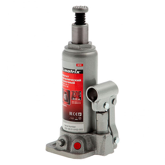 Гидравлический бутылочный домкрат Matrix 50754 поднимает грузы массой до 4 т на высоту до 372 мм. За счет минимальной высоты подхвата 194 мм он оптимален для машин с большим клиренсом. Домкрат станет незаменимым помощником для автолюбителей при проведении технического обслуживания и ремонте авто в дороге или в гараже. Также он подходит для полупрофессионального применения на станциях ТО.