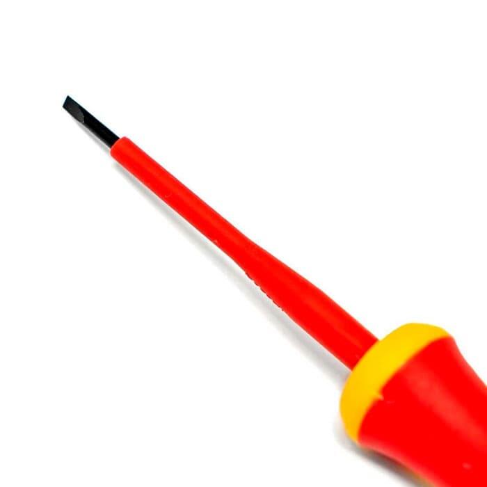 Диэлектрическая отвертка — это ручной инструмент, применяемый для откручивания и закручивания резьбовых крепежей, имеющих на головке шлиц, находящихся под электрическим напряжением или в близи проводников, находящихся под напряжением.Характеристики