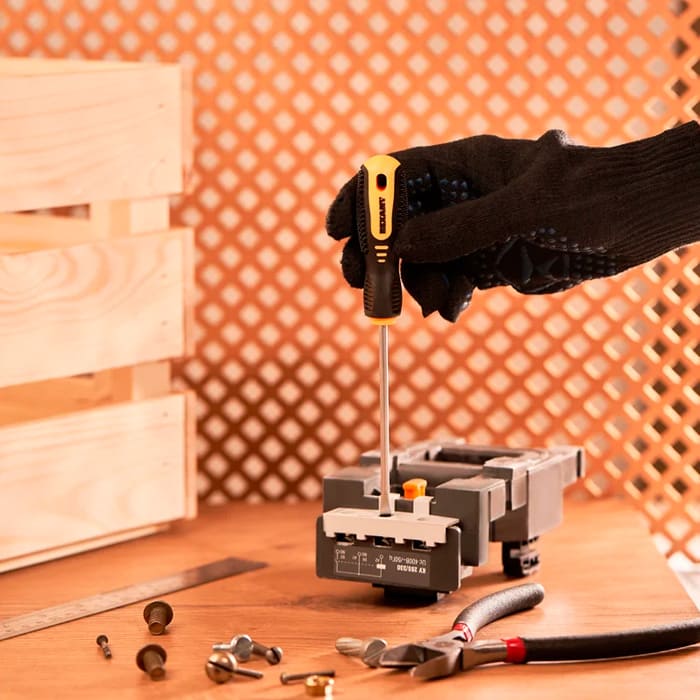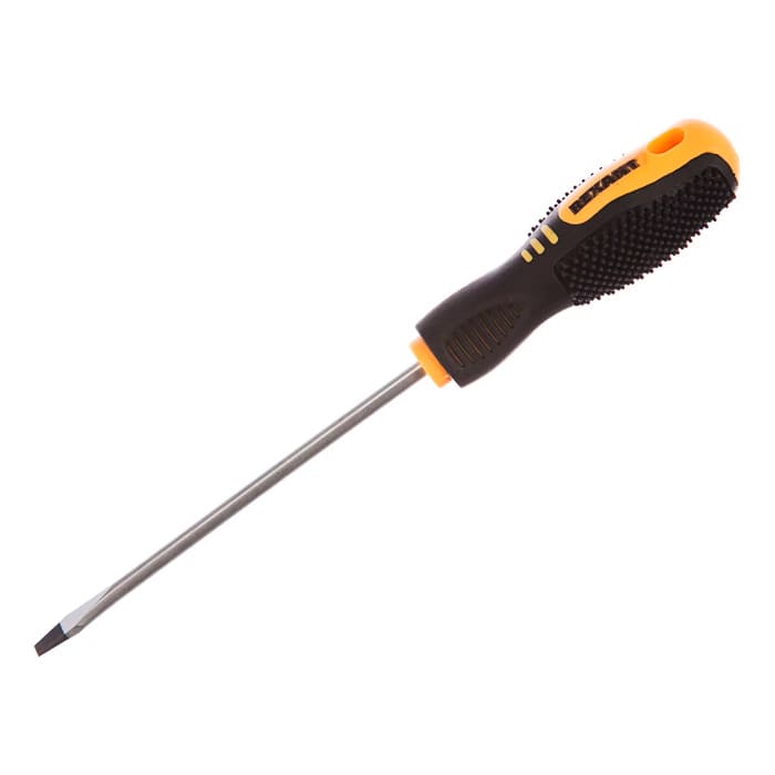 Отвертка шлицевая Rexant используется для монтажа и демонтажа резьбовых соединений (шурупов, саморезов), имеющих на головке прямой паз. Оснащена эргономичной двухкомпонентной рукояткой, которая предотвращает скольжение в ладони и обеспечивает более комфортную работу. Инструмент обладает стержнем, который изготовлен из высококачественной хромованадиевой стали, характеризующейся высокой стойкостью к коррозии. Благодаря оксидированному намагниченному наконечнику крепежная деталь не упадет при извлечении или установке. В основании инструмента предусмотрено отверстие для его подвеса.Характеристики
