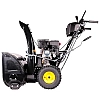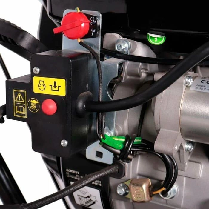 Несколько скоростей передвижения снегоуборщика вперед и назад. Управление вы осуществляете рычагом на панели. 6 скоростей вперед и 2 скорости назад дают возможность оператору подобрать скорость под различные условия работы в зависимости от количества выпавшего снега. Металлический желоб (труба) выброса. Обеспечивает долговечность конструкции Металлический ковш и шнек. Справляются с любым типом снега. Разблокировка колес шплинтом на колесе. Предназначена для улучшения маневренности снегоотбрасывателя. Разблокировка происходит за счет освобождения от жесткого соединения шплинтом ступицы колеса от ведущего вала. Регулировка направления выброса регулируется вращением рукоятки, вынесенной к оператору. Поворот желоба выброса - 190°. Регулировка дальности выбора - осуществляется с помощью рукоятки на панели оператора Металлические полозья. Регулировка по высоте позволяет защитить поверхность и дает возможность работать на любых покрытиях, включая плитку и брусчатку. Двухстороняя конструкция увеличивает их срок службы вдвое. Электрический стартер на 220В. Подключается к источнику питания и вы можете запустить двигатель нажав кнопку на двигателе снегоуборщика. Теплый двигатель вы можете легко завести пусковой рукояткой. Обеспечивает легкий запуск при любых отрицательных температурах. Фара для работы в тёмное время суток. Пневмоколеса с агрессивным протектором. Обеспечивают хорошее сцепление с поверхностью с минимальной пробуксовкой, легкость управления машиной и простоту обслуживания.