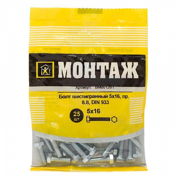 Болт шестигранный М5*16 мм Монтаж цинк DIN 933 25 шт