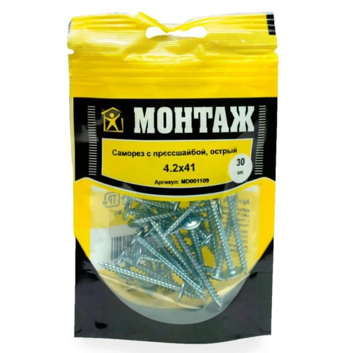 Саморез 4.2*41 мм Монтаж с прессшайбой острый цинк дой-пак S 30 шт