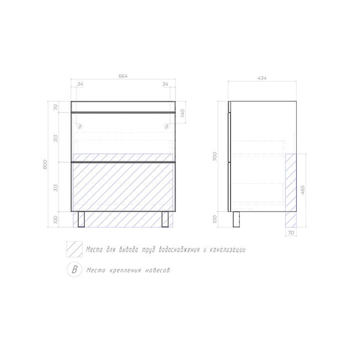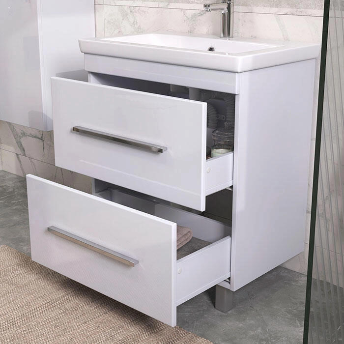 Тумба для ванной комнаты Vigo Land 700-0-2 изготовлена из современных влагостойких материалов. Имеет два выдвижных ящика для хранения вещей, оснащенных скрытыми направляющими Hafele, 2 опоры квадратные регулируемые, 1 сифон.Характеристики