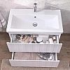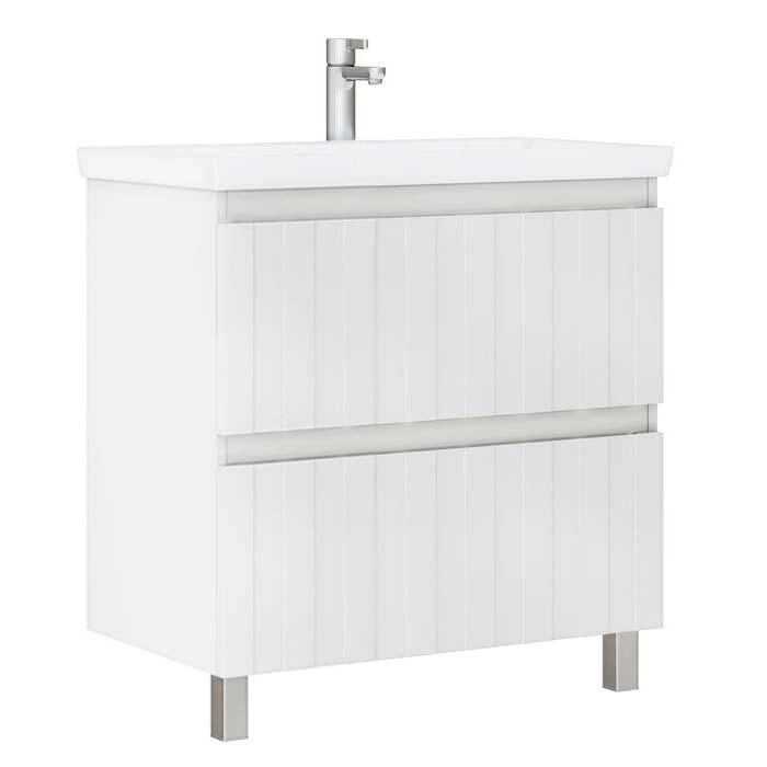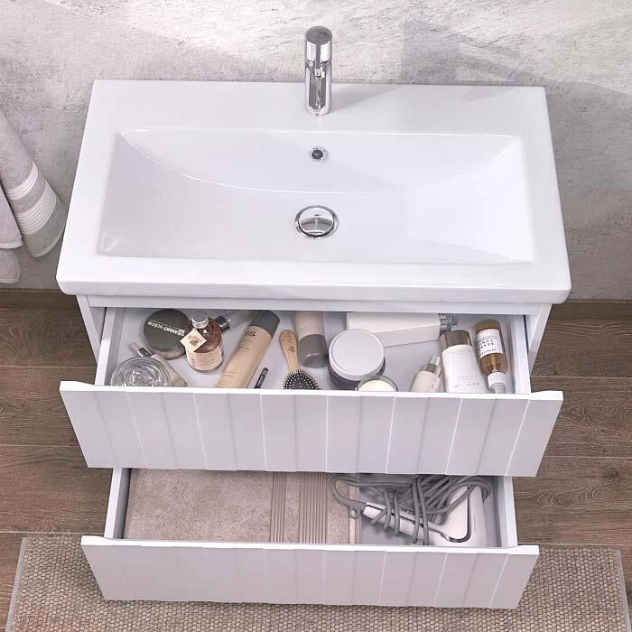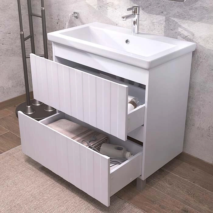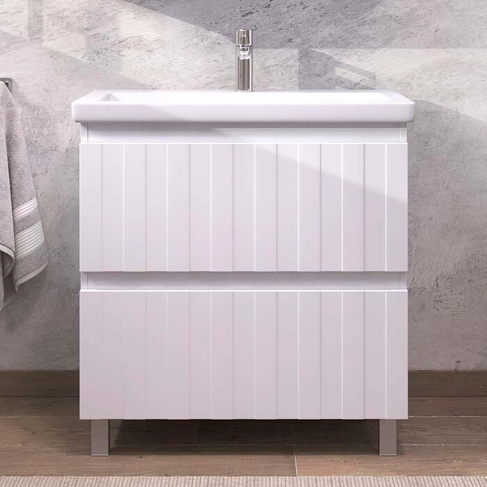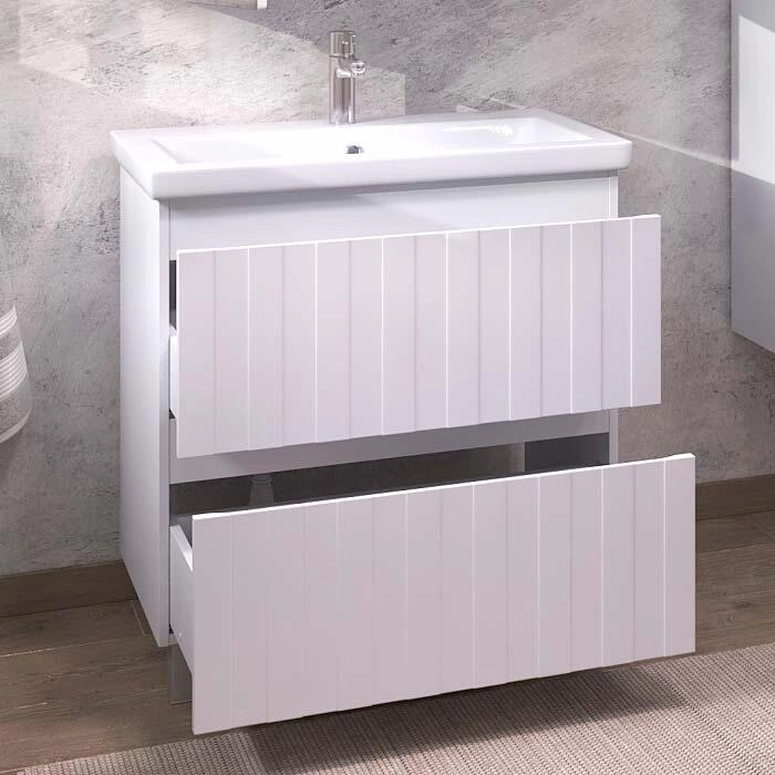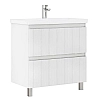 Тумба Finlay 800-0-2 с двумя выдвижными ящиками с мягким закрыванием, интегрированные ручки, 2 опоры квадратные регулируемые. Матовые фасады с фрезеровкой и интегрированные ручки создают эффект минимализма. Скрытые направляющие обеспечивают плавный ход ящика и комфортную эксплуатацию тумбы. Фарфоровый умывальник крепится на тумбу, имеет отверстие под смеситель и перелив.Характеристики