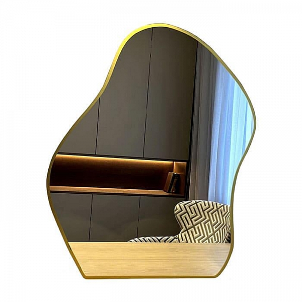 Ассиметричное зеркало — необычное, интересное и ориганальное решение для любого интерьера. Золотая окантовка выполнена методом УФ-печати. Влагостойкое зеркальное полотно не искажает и не затемняет отражение.Характеристики