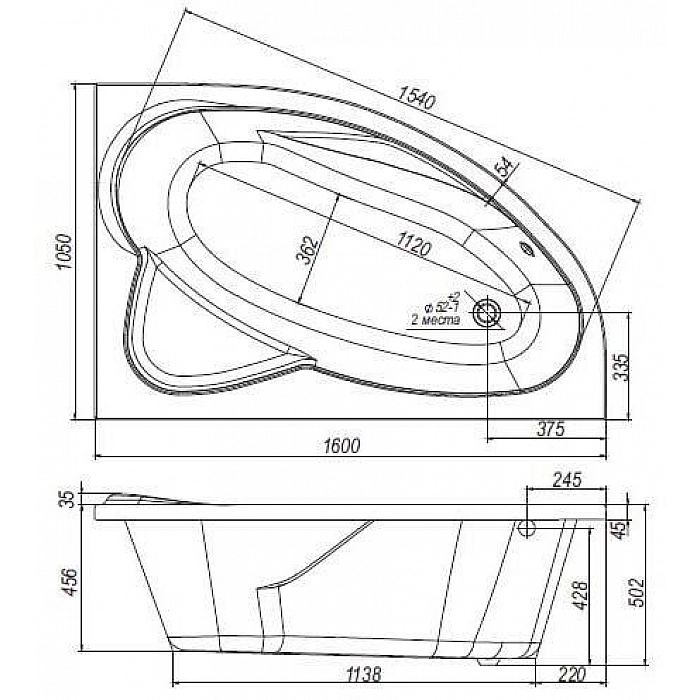 Ванна акриловая ВентоСпа Nika LA 160*105 см R без сифона, каркаса и крепления