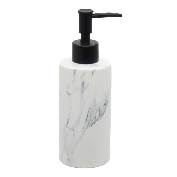 Дозатор для жидкого мыла. Объем 275 мл. Произведено из керамики. Носик пластиковый черного цвета. Матовая поверхность с имитацией мрамора.Характеристики
