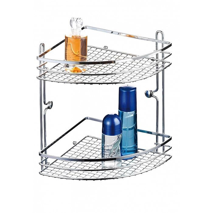 Полка подвесная угловая двухуровневая. Крепится к стене шурупами. Произведено из хромированной стали.