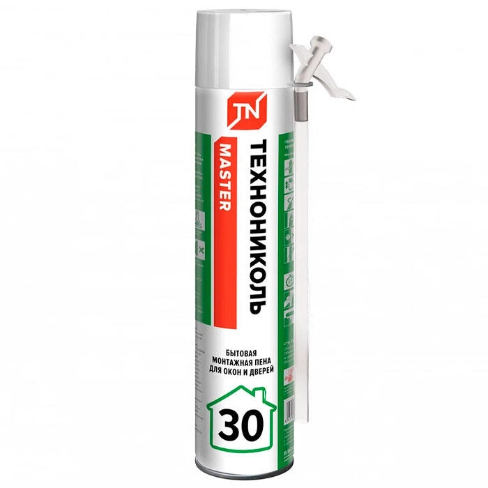 Пена монтажная ТехноНиколь Master 30 бытовая представляет собой однокомпонентный полиуретановый материал в аэрозольной упаковке. Монтажная пена снабжена специальным адаптером. Не оказывает избыточного давления на элементы конструкции. Пена обладает высокой адгезией к большинству строительных материалов: бетон, кирпич, дерево, металл и т.д., за исключением полиэтилена, силикона, тефлона. Для установки оконных и дверных блоков, подоконников, крепления стеновых панелей, герметизации щелей, пустот, тепло- и шумоизоляции швов, а также для других строительных и отделочных работ. Обеспечивает хорошую тепло- и звукоизоляцию. Затвердевает под действием влаги.Характеристики