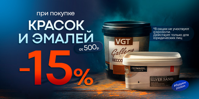 -15% на краски и эмали при покупке на сумму от 500 руб.
