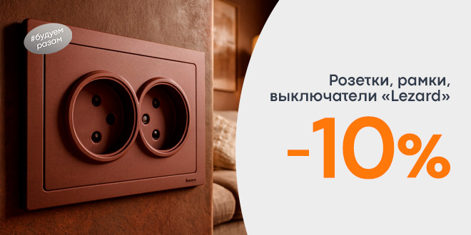 Скидка 10% на розетки, рамки, выключатели Lezard